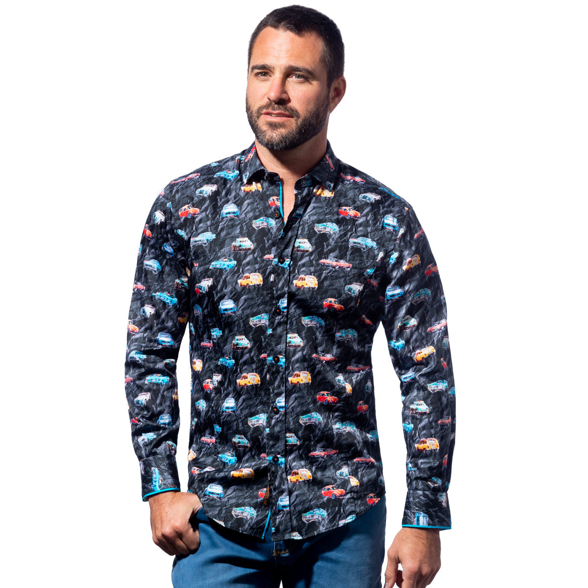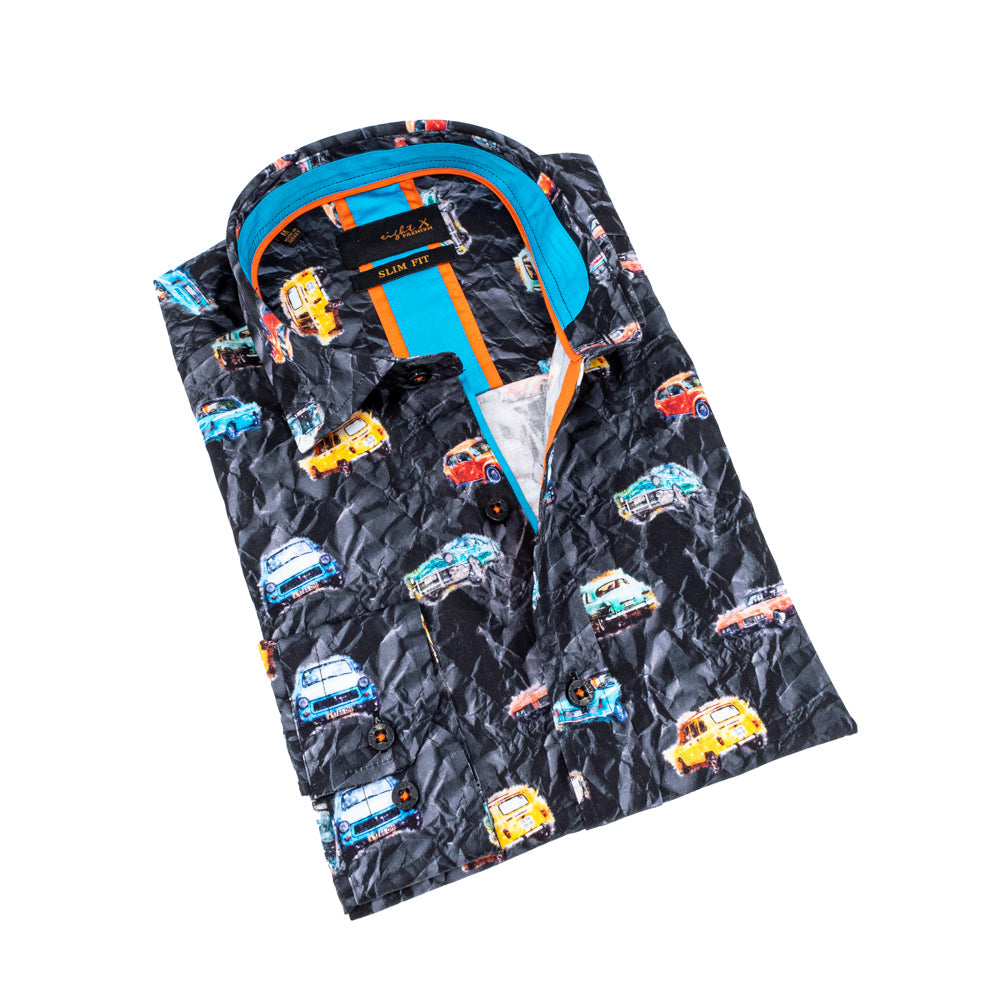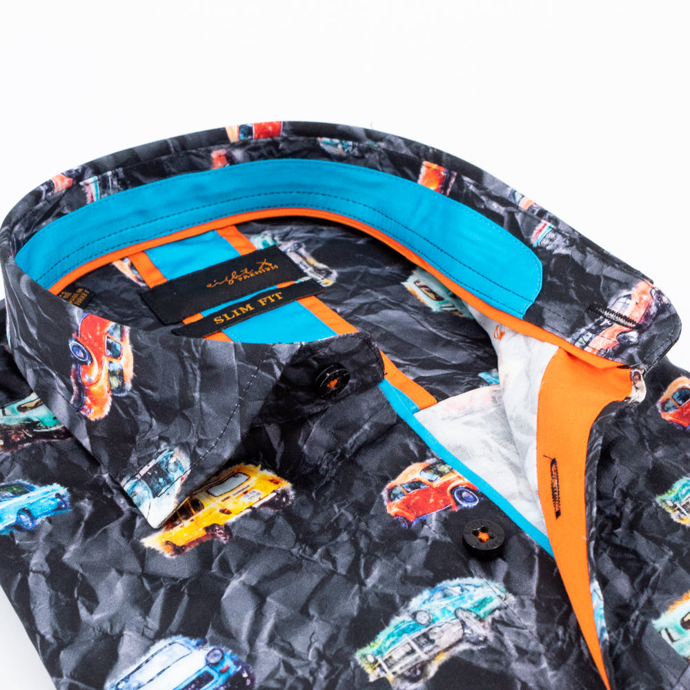 The Night Cruise button down shirt is an homage to the classics. Featuring a vintage printed texture and beautiful old school car pattern, this black shirt captures what it feels like to cruise around in night in your favorite motorcar. Cut in our universally flatter Signature Slim Fit from ultra soft cotton, Night Cruise is a super smooth ride.