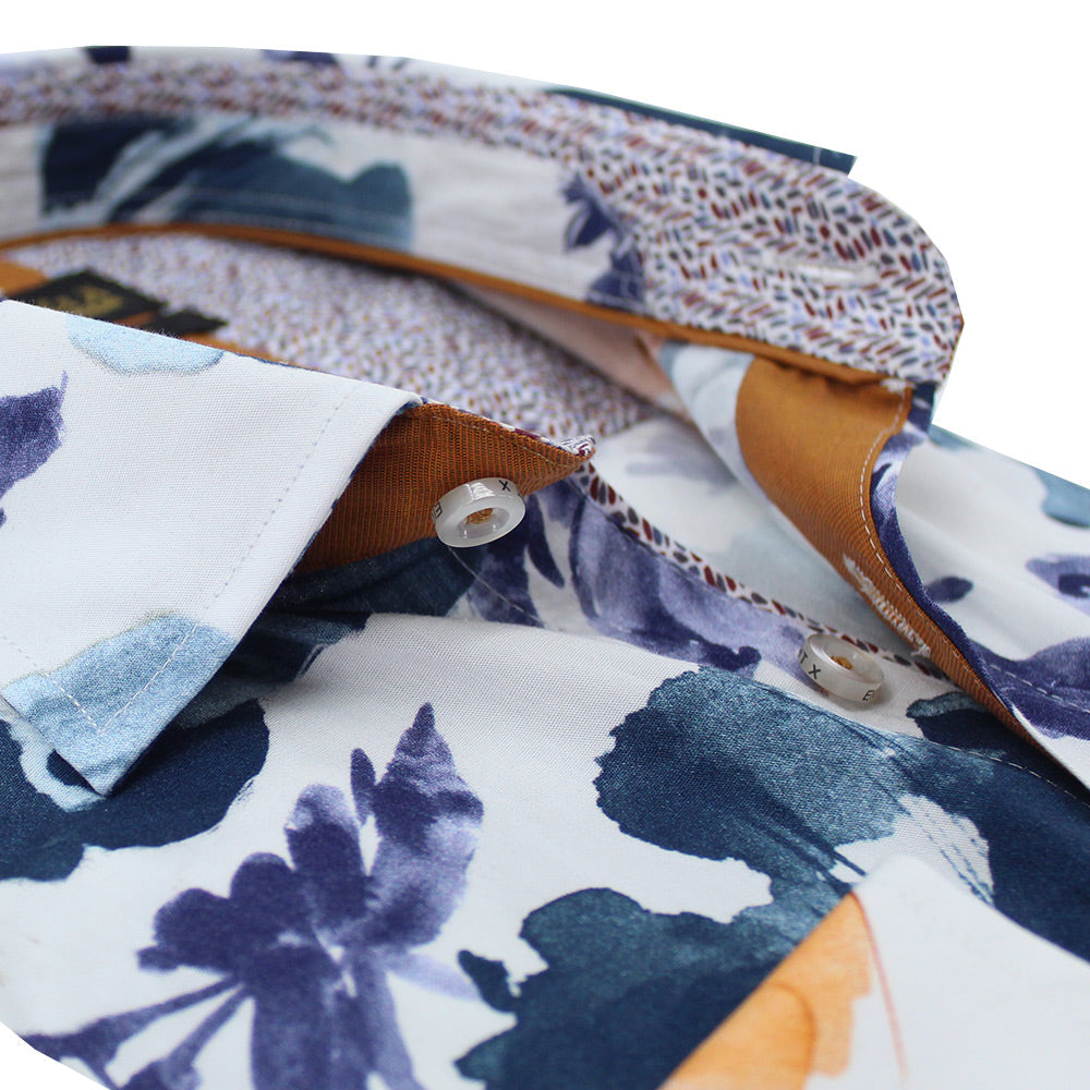 This tasteful white button up shirt exudes wearable art with these blends of watercolor. This shirt gives the look of movement.  The high quality pure cotton fabric makes it the perfect shirt for any weather. The modern slim fit cut provides a complimentary and confident look.
