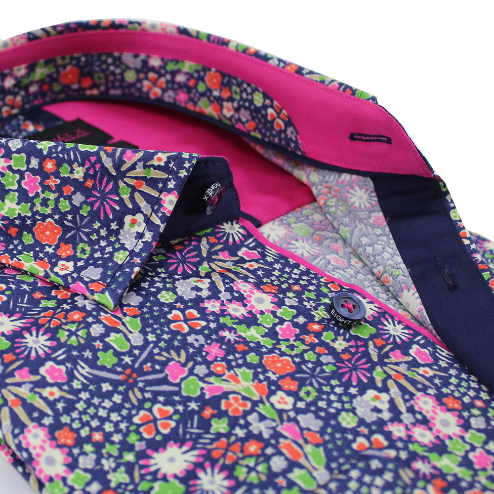 The exciting shirt adds an exciting spark of fun to a floral print. The navy and fuchsia trim are bold against the background allowing you to wear this shirt to any day or night event. The high quality pure cotton fabric makes it the perfect shirt for any weather. The modern slim fit cut provides a complimentary and confident look.