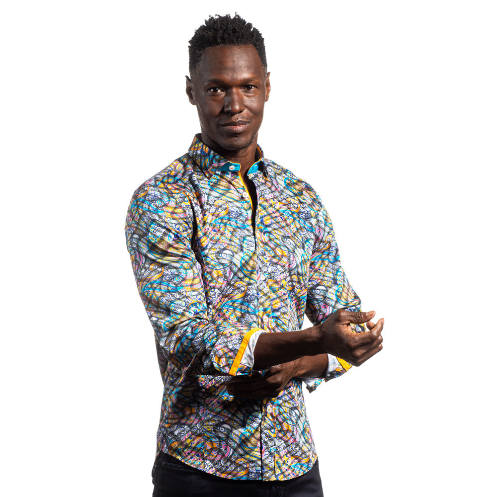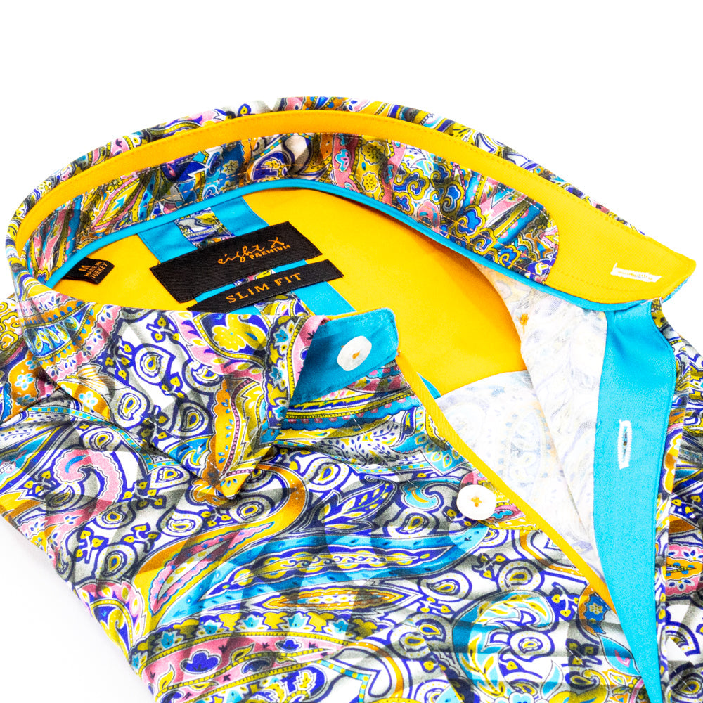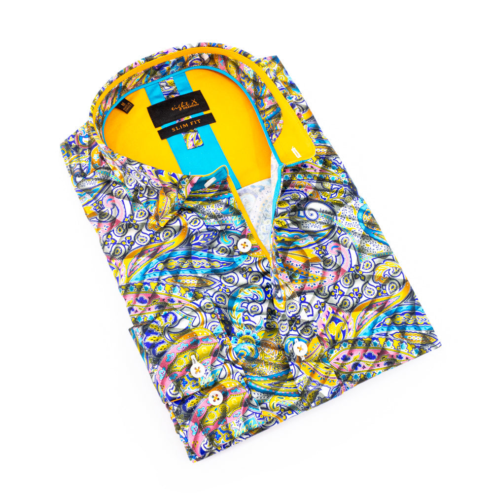 Express yourself in this Bohemian Rhapsody print shirt. Features a bold colorful paisley pattern, golden orange trim, and our signature universally flattering Slim Fit.