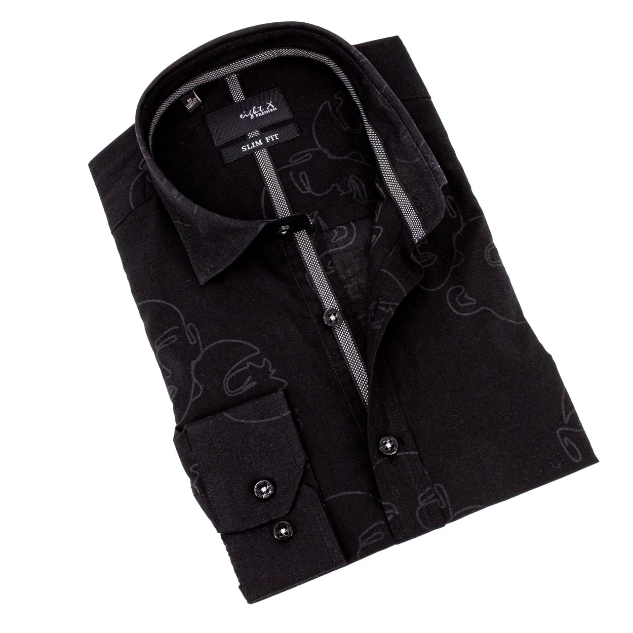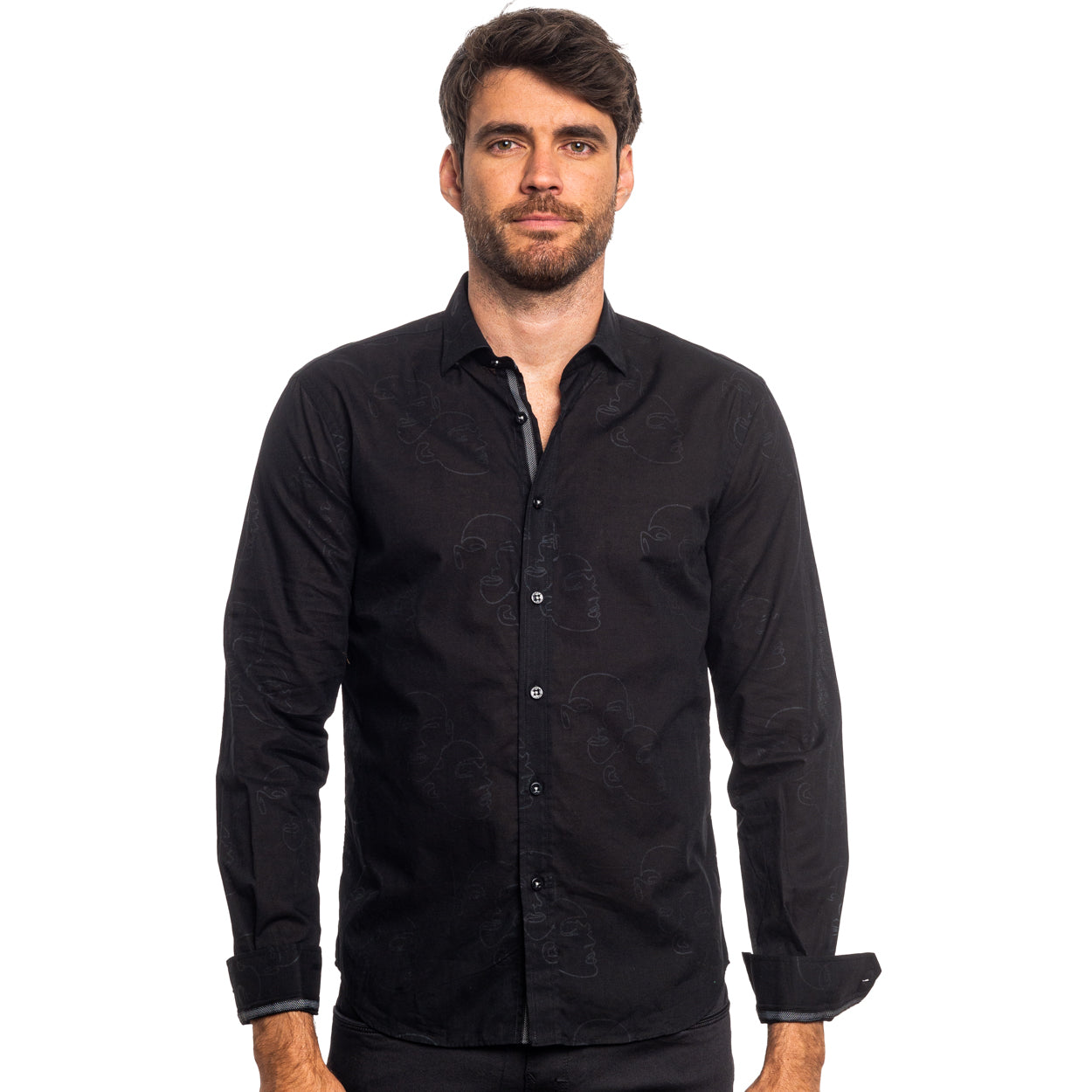 Add a hint of excitement to your look with our "Faces" button down shirt.  Handcrafted from select Italian cotton, "Faces" features a line-drawn face motif done in foil.  Classy yet cool, this shirt pairs great with black or white pants and jeans.