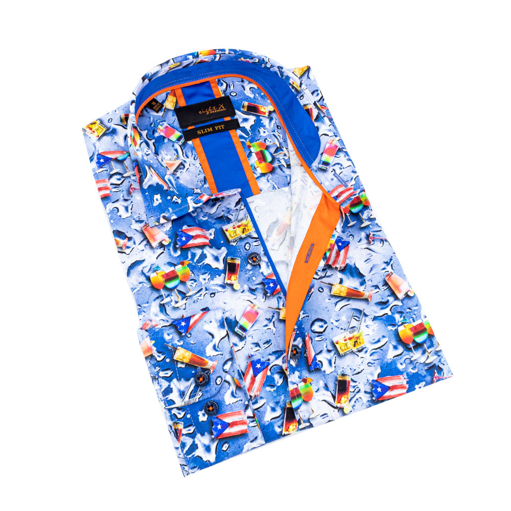 La Hora Feliz button down shirt celebrates vibrant, beautiful Puerto Rico. Featuring a tropical cocktail, Puerto Rican flag and waterdrop pattern, this blue shirt brings you right to the island. Cut in our universally flatter Signature Slim Fit from ultra soft cotton, La Hora Feliz warms your spirit.