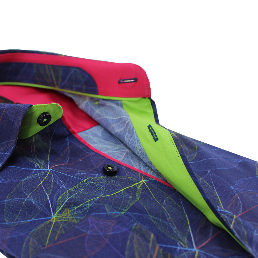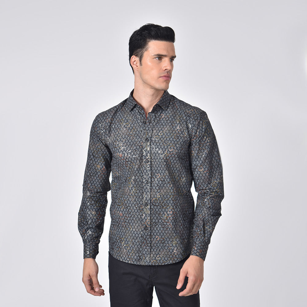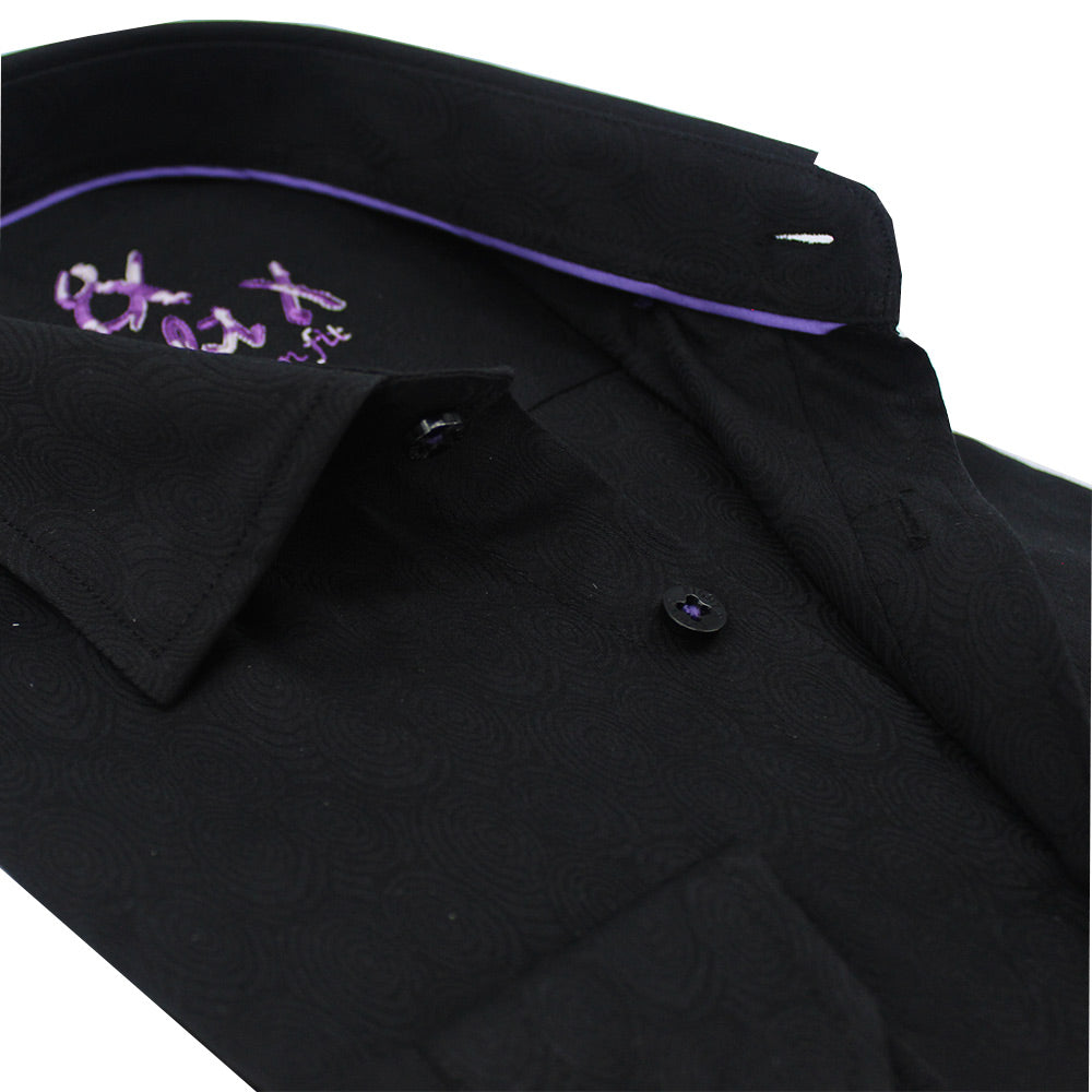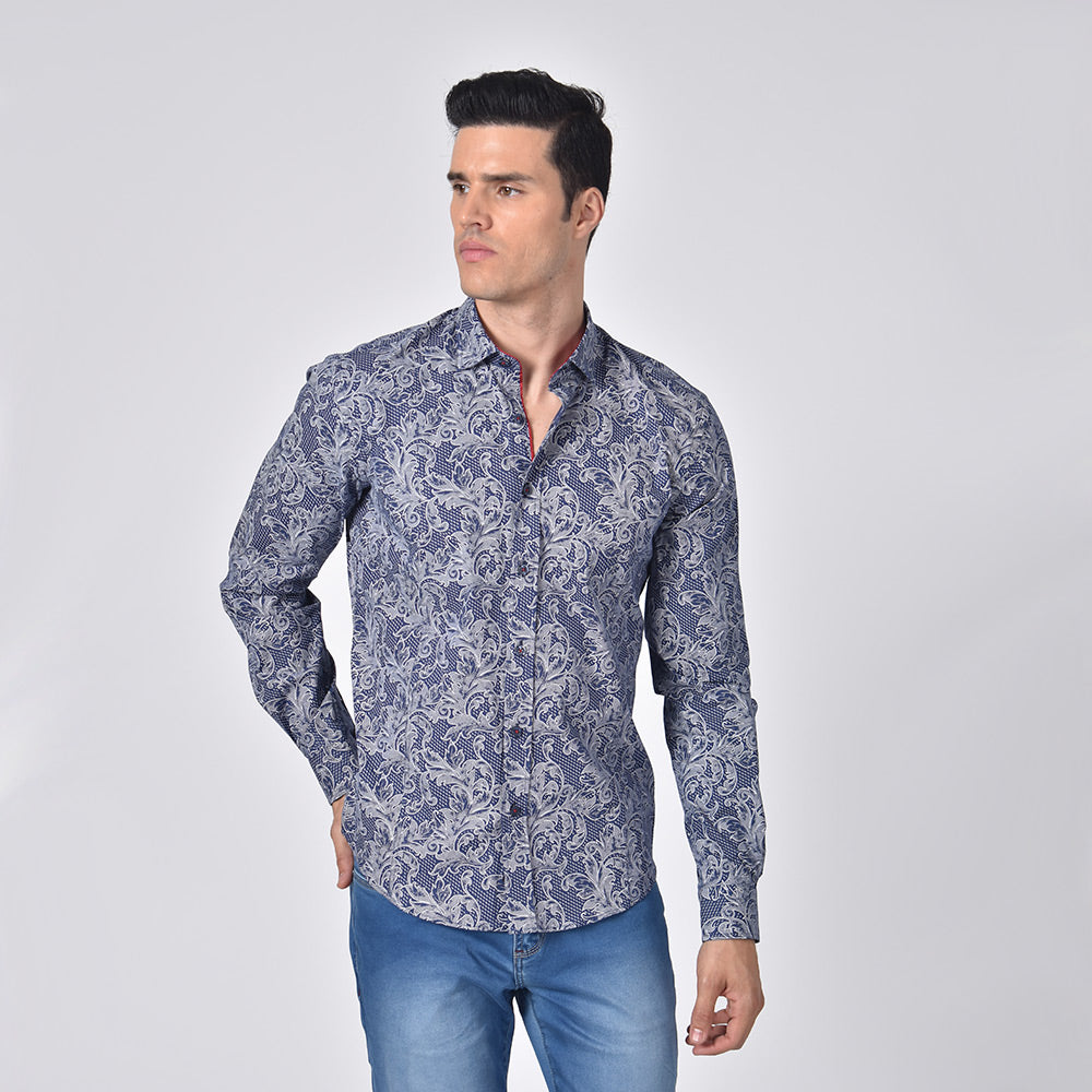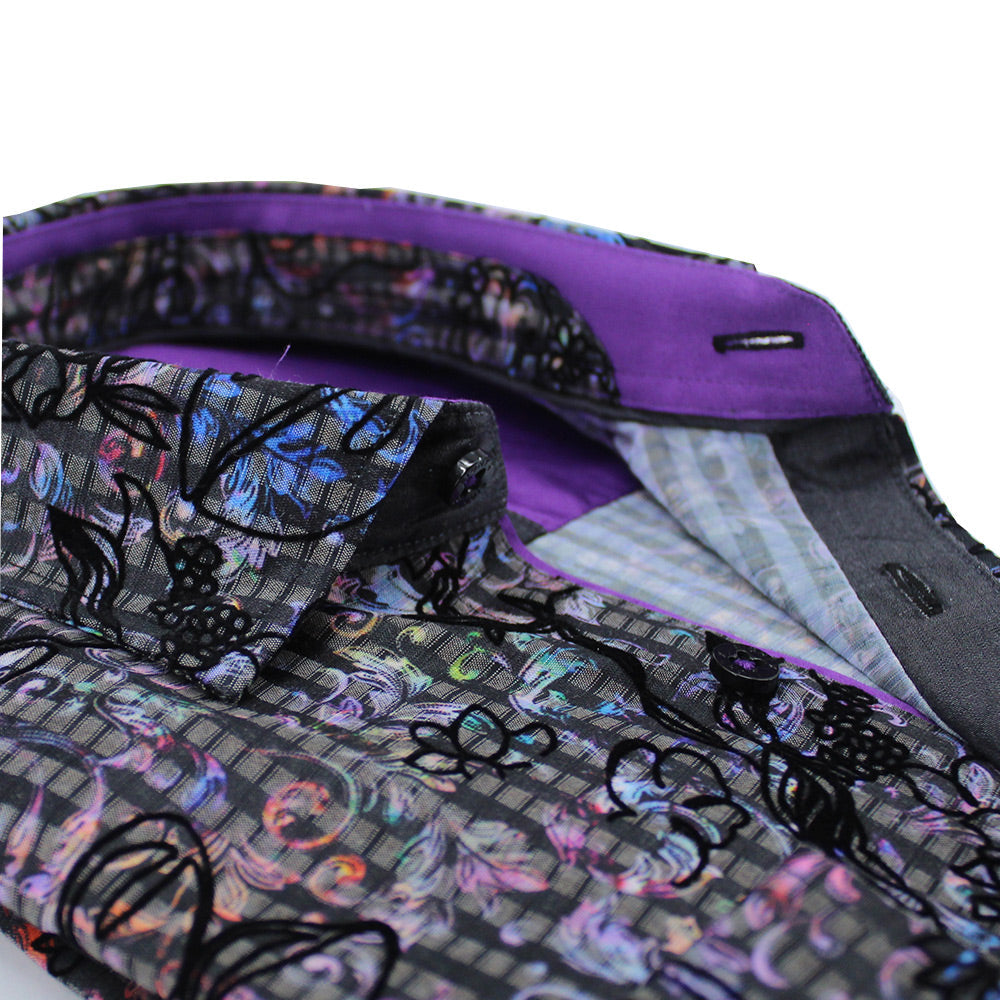 Grid and Vine Print Foil Jacquard Shirt With Burgundy Trim
