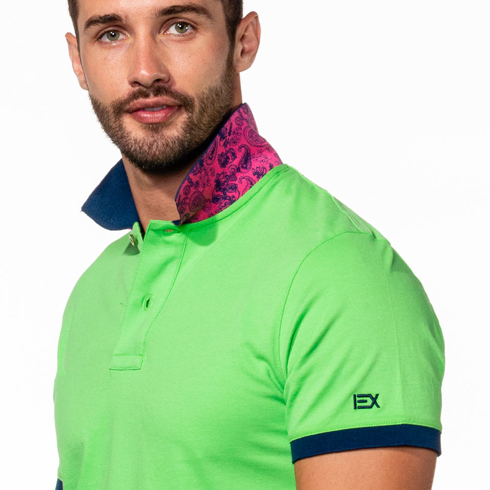 Green Polo with Double Sided Navy and Fuchsia Paisley Print Collar
