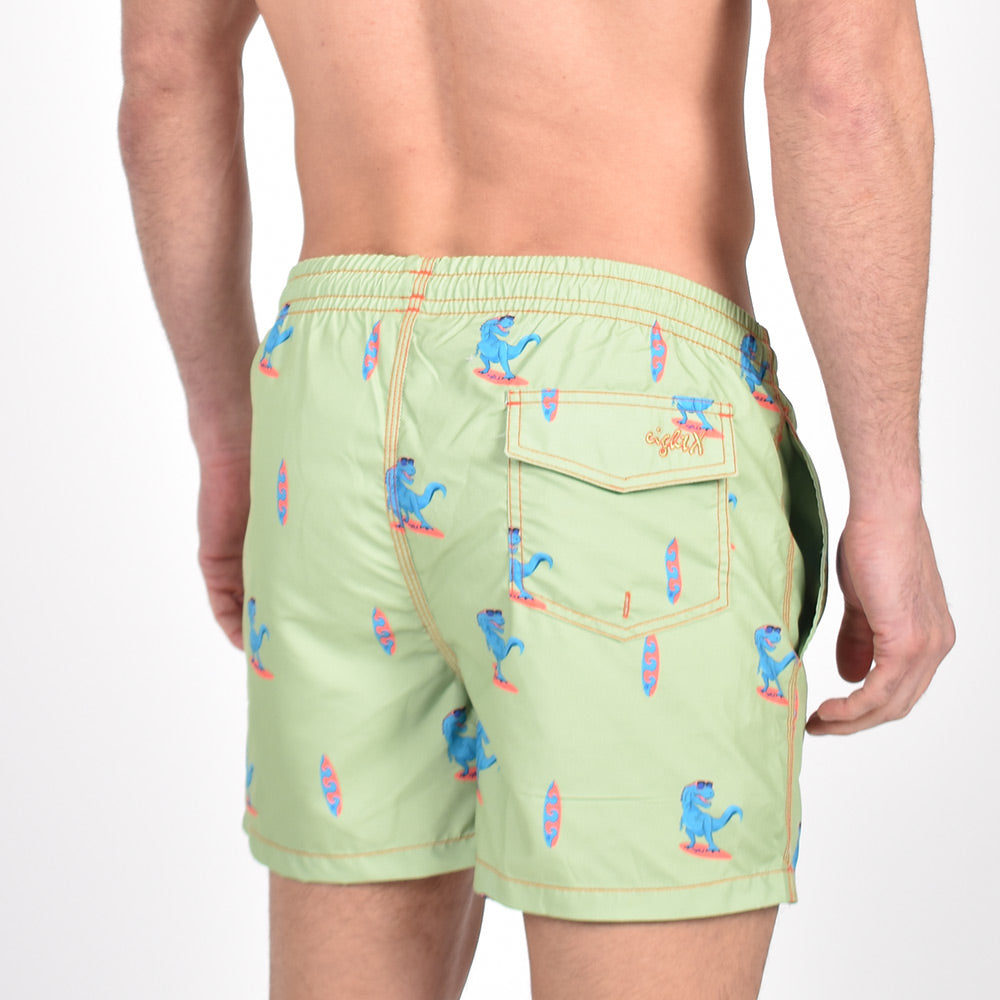 Get ready to show out in these fun , surfing T-Rex green trunks this summer. These trunks have side pockets, as well a back pocket for your things, a comfortable elastic waist with drawstrings, and a custom print all over. The perfect above the knee length and comfortable fabric means you can wear them all day as you enjoy the beach, a pool party, or anywhere else you may need a good pair of trunks!