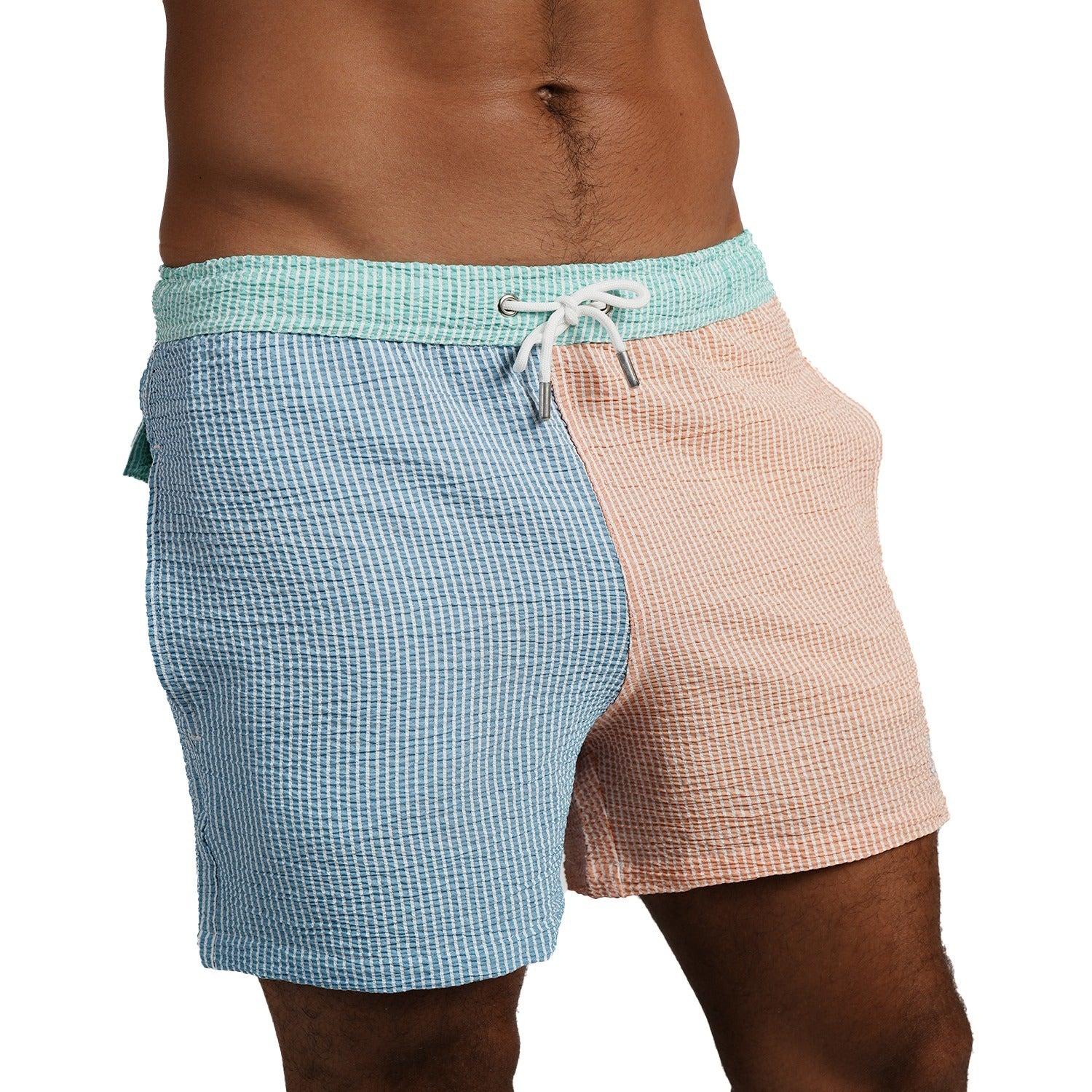 These swim trunks sit just above the knee and are made from breathable, comfortable fabric. They feature a water-repellent coating that allows water to slide off. Available in several light, fresh shades perfect for the beach or pool.