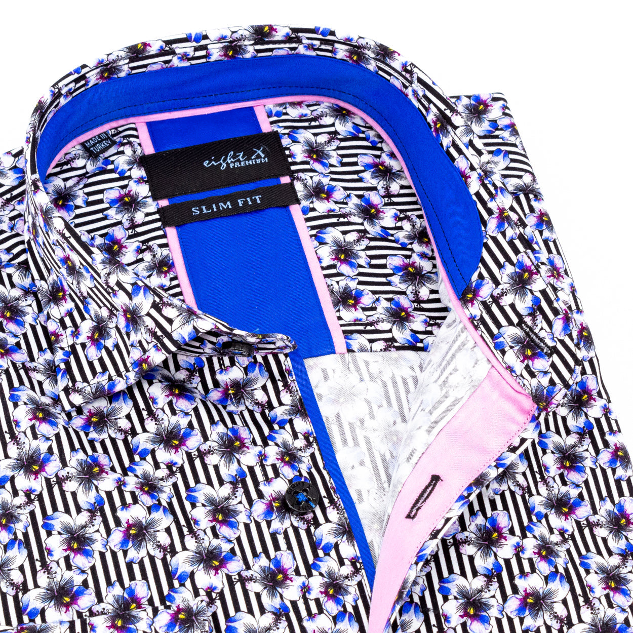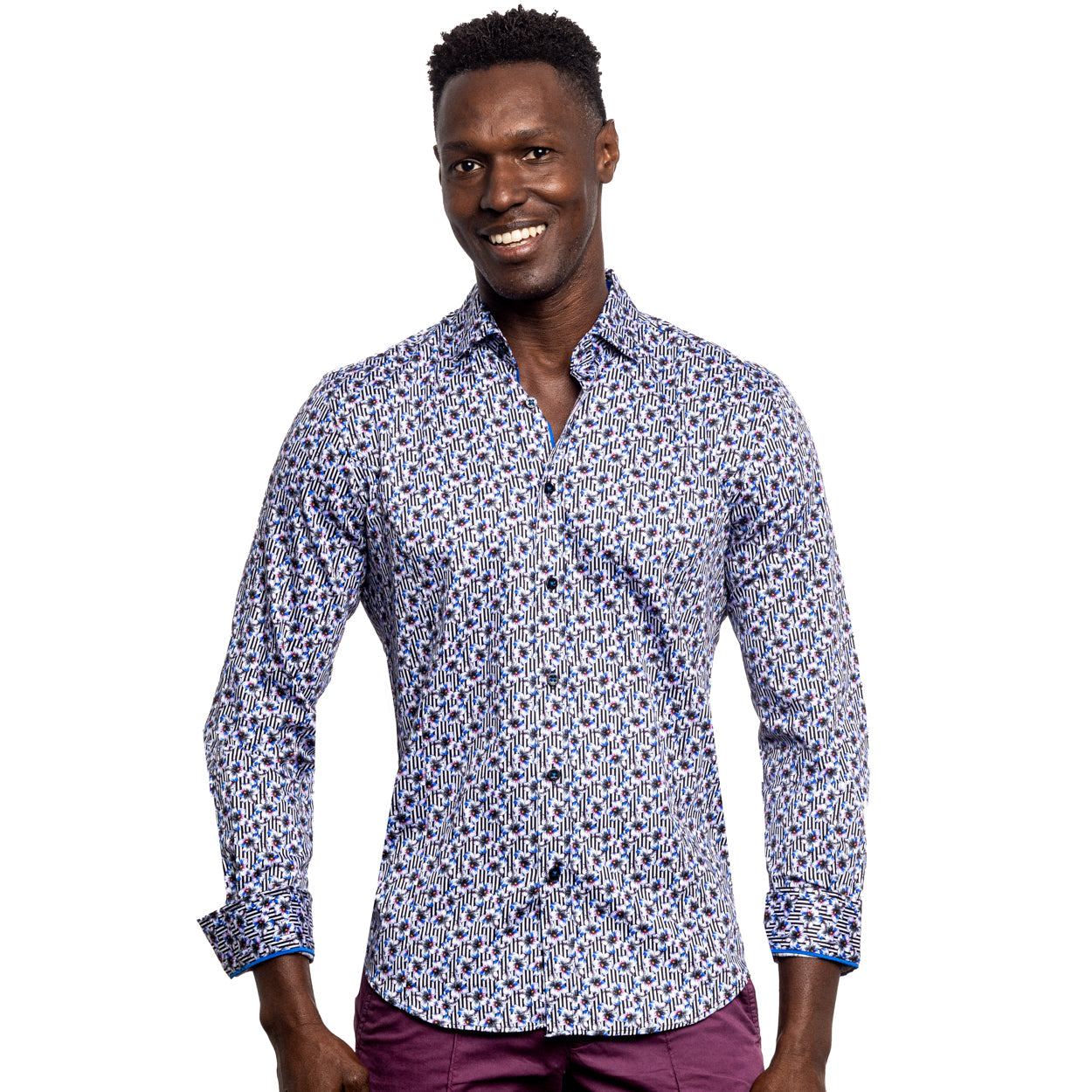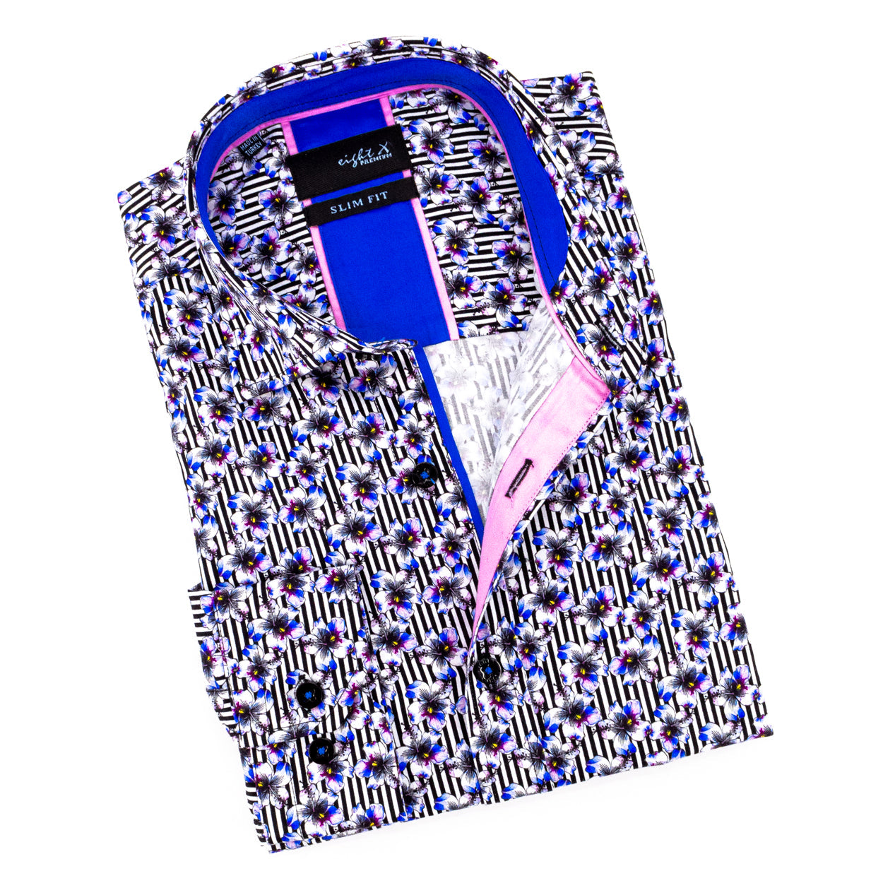 Deje que su vida florezca con esta camisa con botones hecha a mano "Memphis Medley". Con rayas verticales bajo un motivo floral, esta camisa es una hermosa opción floral.