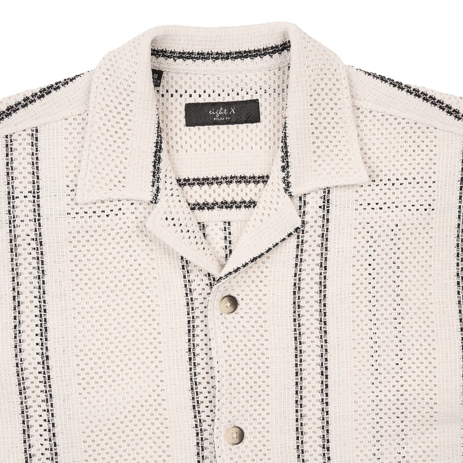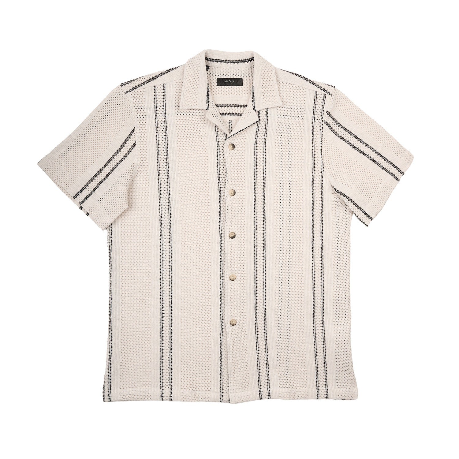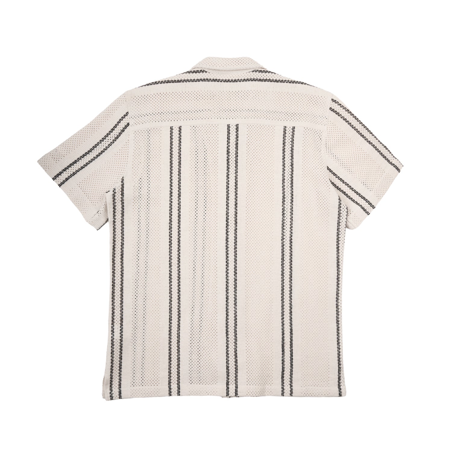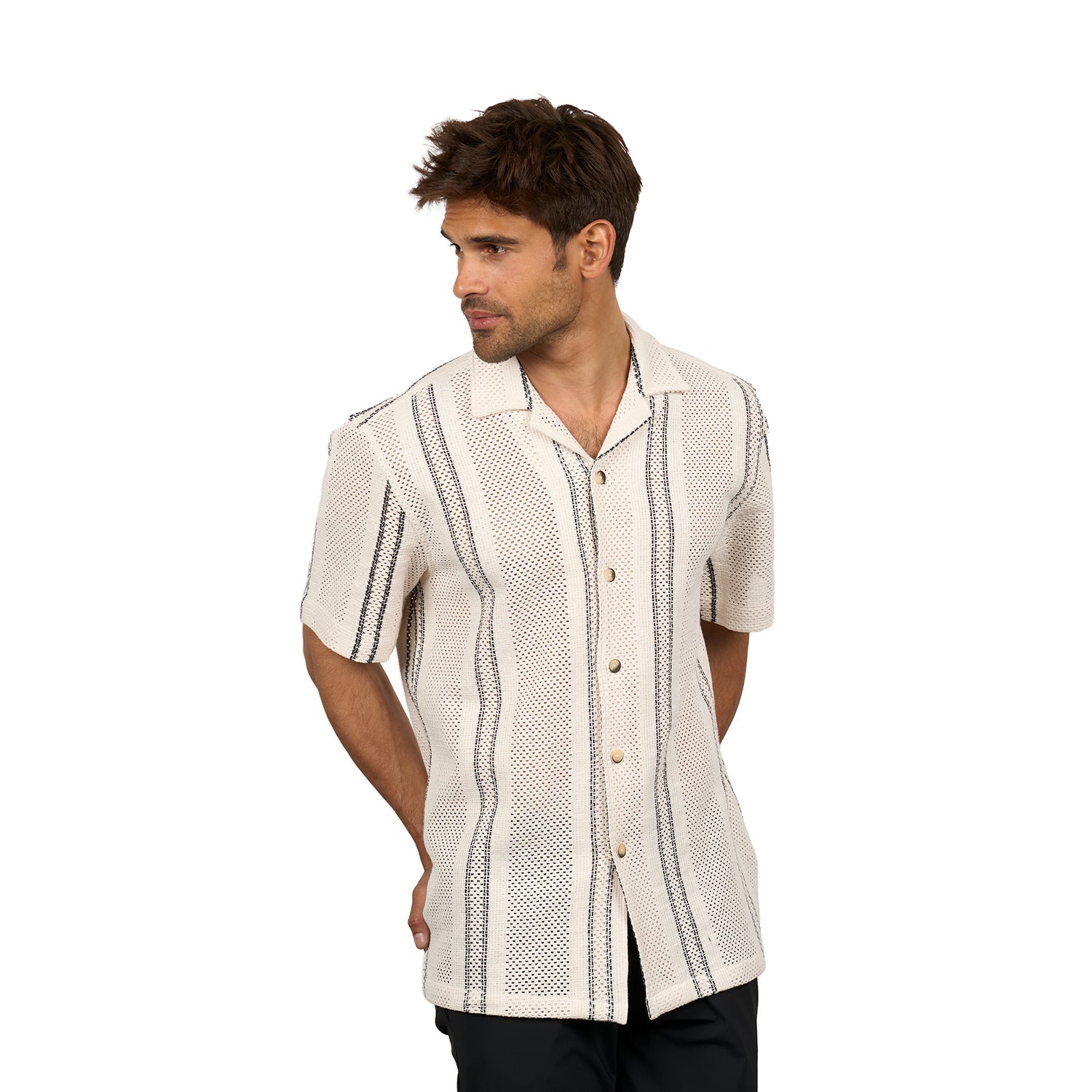 Our new men's crochet textured button up short sleeve shirt. Breatheable and relaxed fit. This cotton open crochet shirt allows you to stay cool. The black minimalistic details offer visual depth and a tactile feel. Designed for effortless comfort and ease of movement, this men's button up chrochet shirt pairs seamlessly with shorts, trousers, or layered over a white tee for versatile, everyday styling.