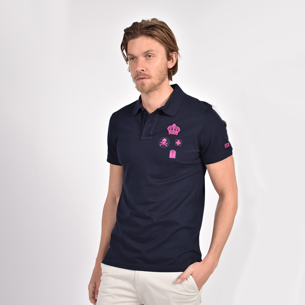 Polo fucsia con cuello de rayas multicolor de doble cara