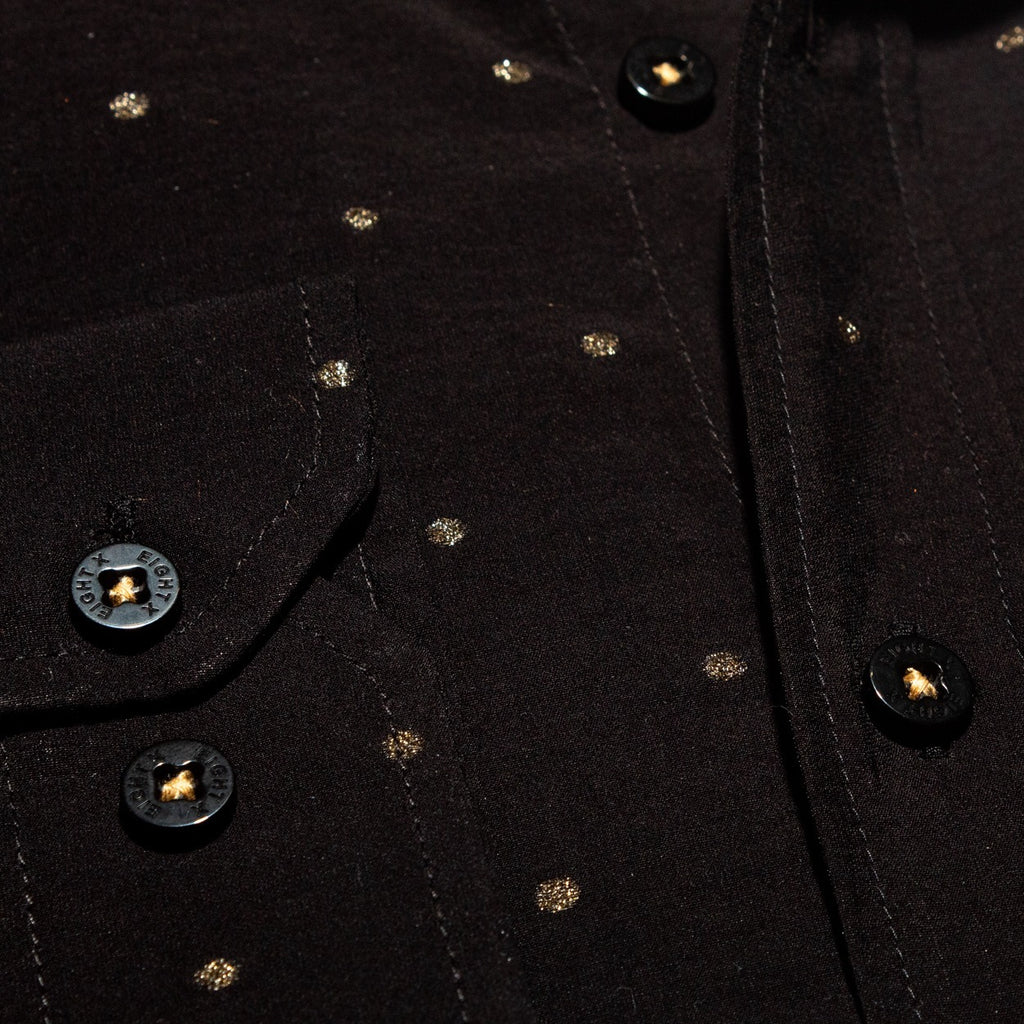 Brilla como una estrella con la camisa abotonada Gold Sparkle. Con detalles dorados cosidos en su suave y ligera tela negra, esta camisa es divertida y elegante a la vez.