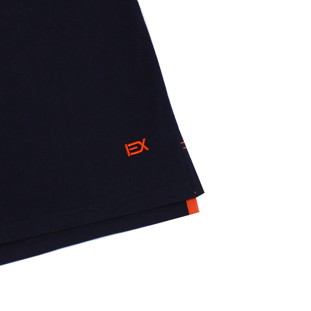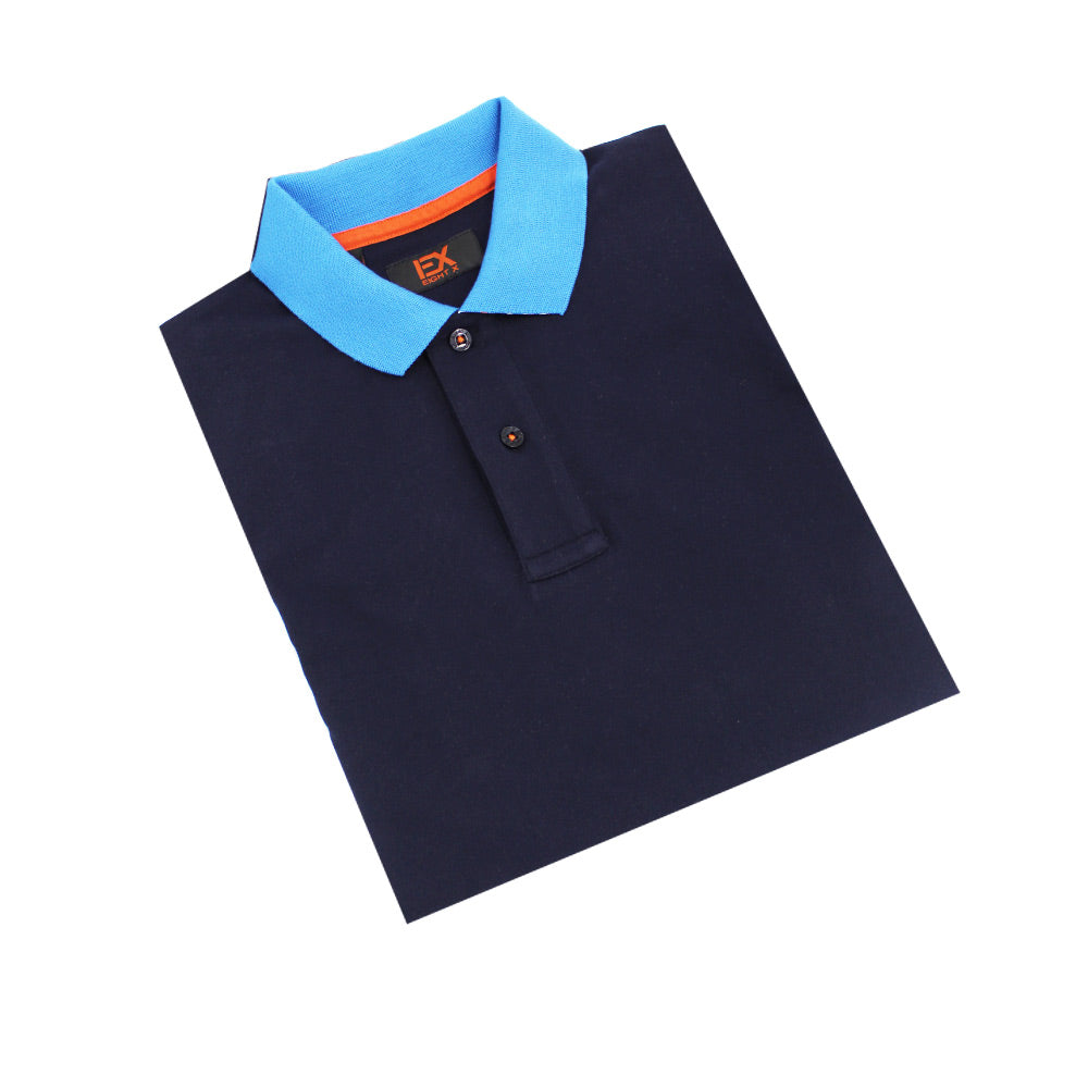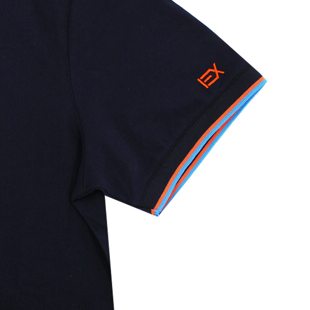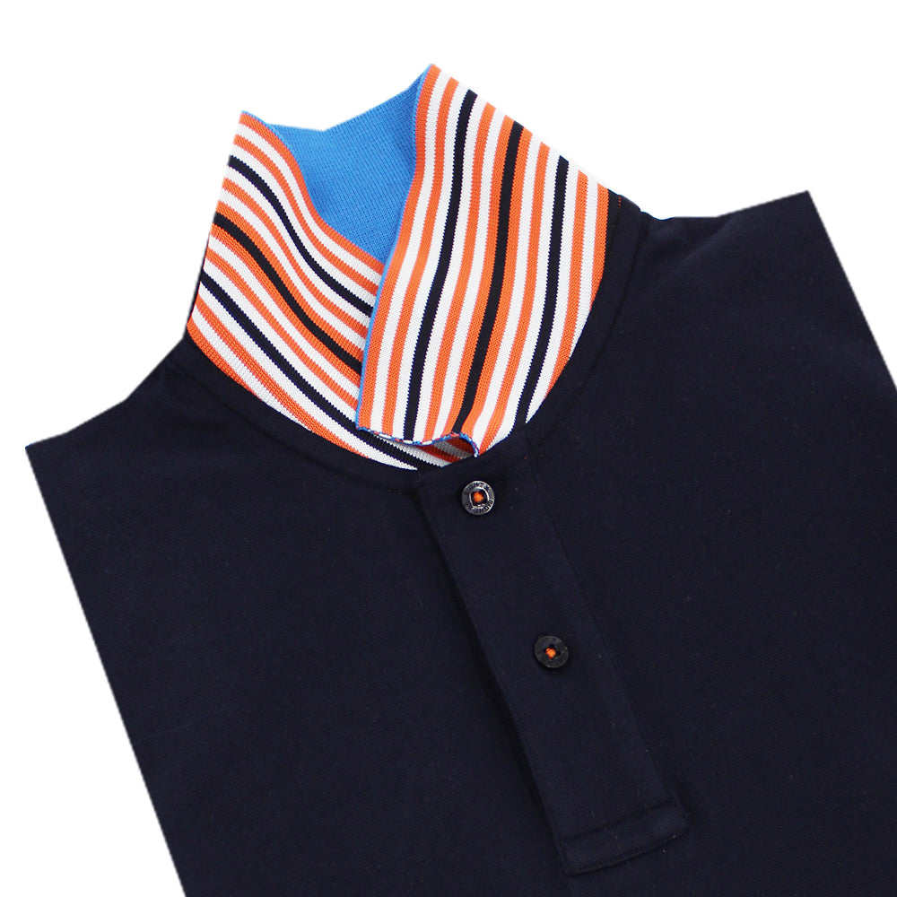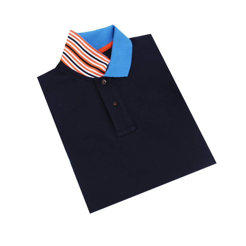 Polo azul marino con cuello azul de doble cara con rayas multicolores