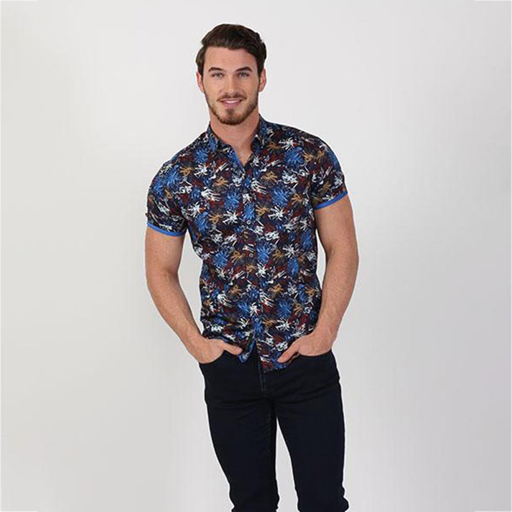 Disfruta de un estilo atrevido y clásico con esta camisa de manga corta con estampado retro azul marino. El tejido de algodón puro de alta calidad la convierte en la camiseta perfecta para cualquier clima. El moderno corte slim fit brinda un estilo complementario y seguro.