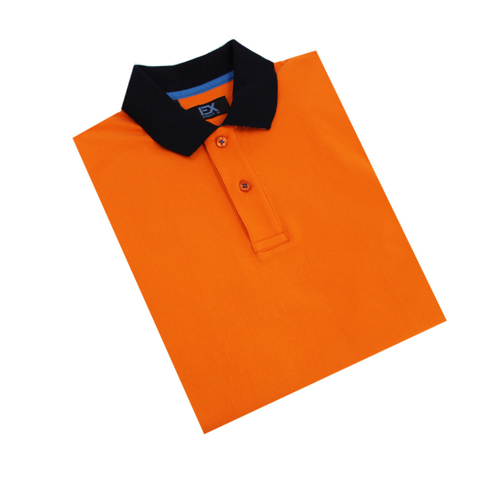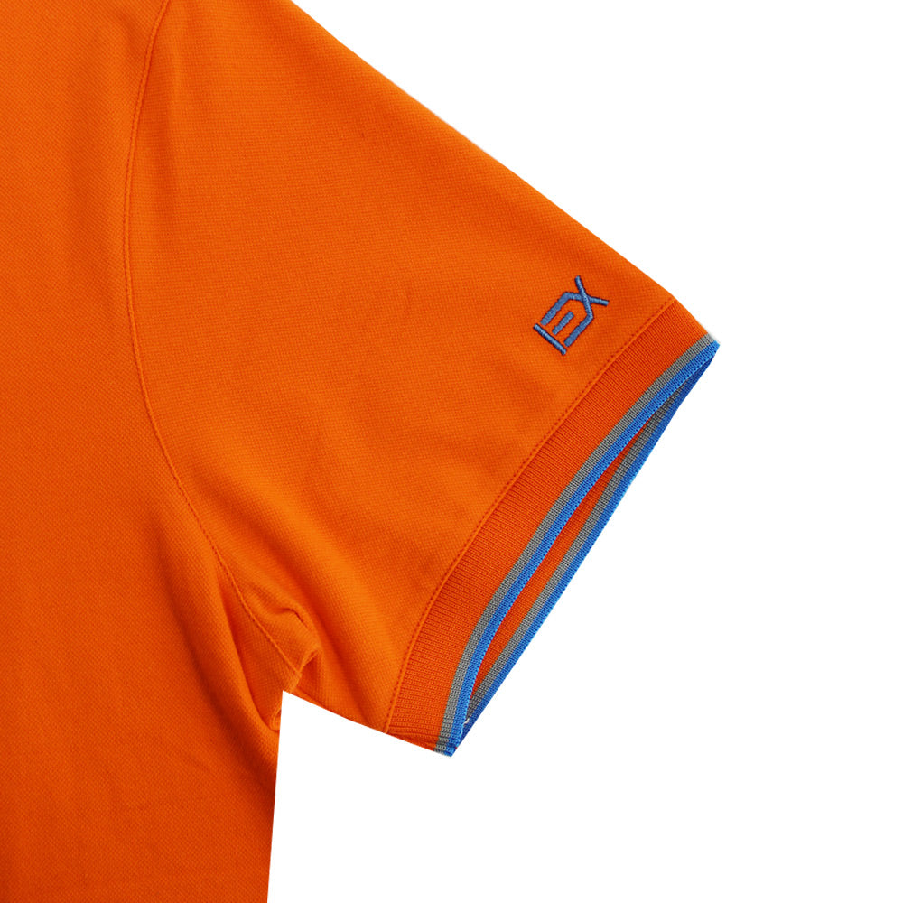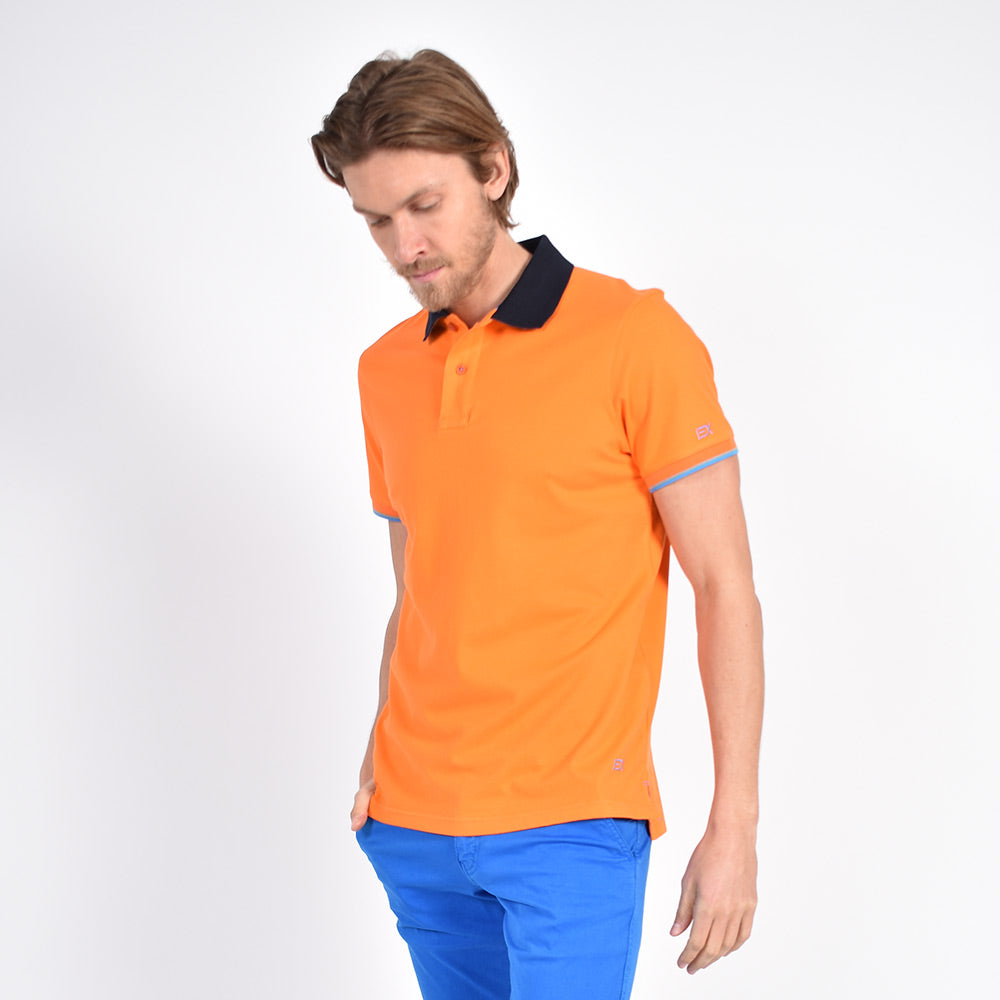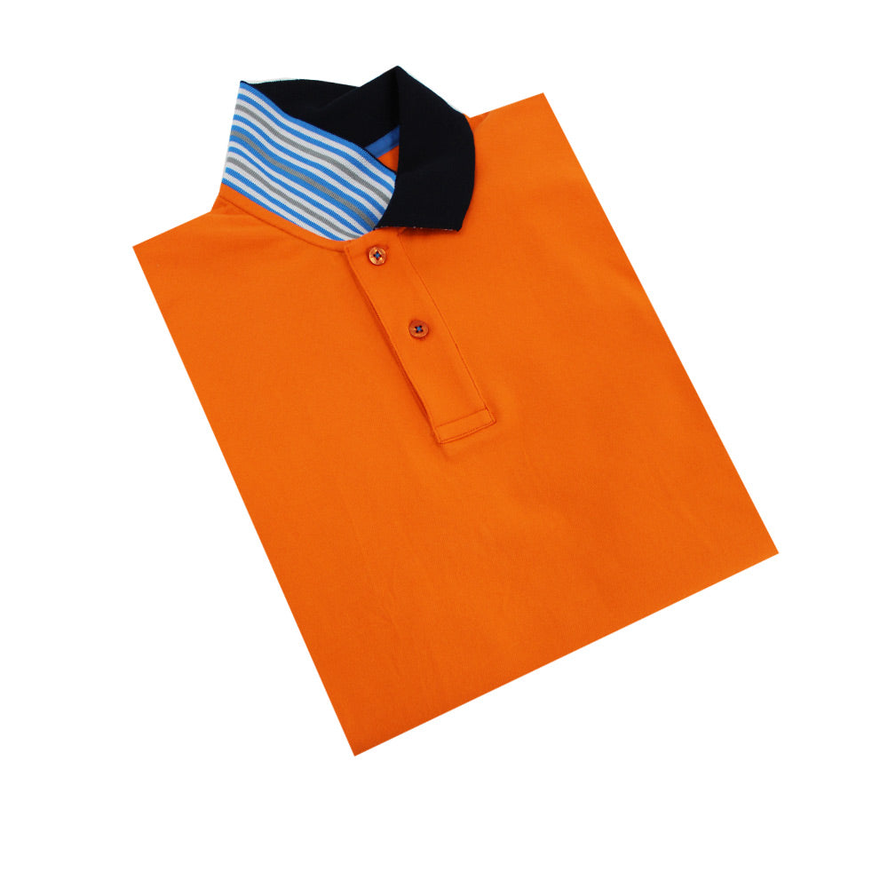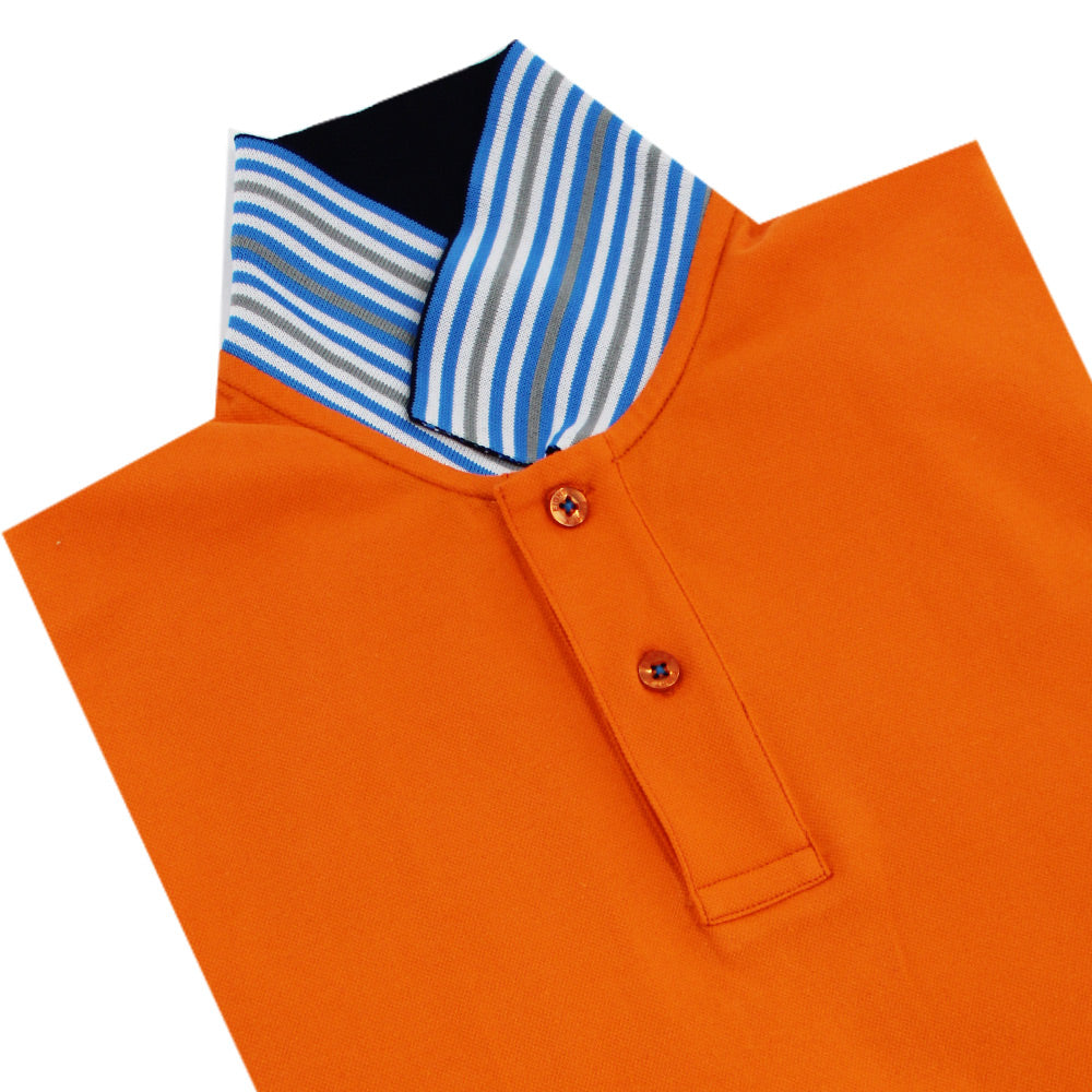 Polo naranja con cuello azul marino de doble cara con rayas multicolores