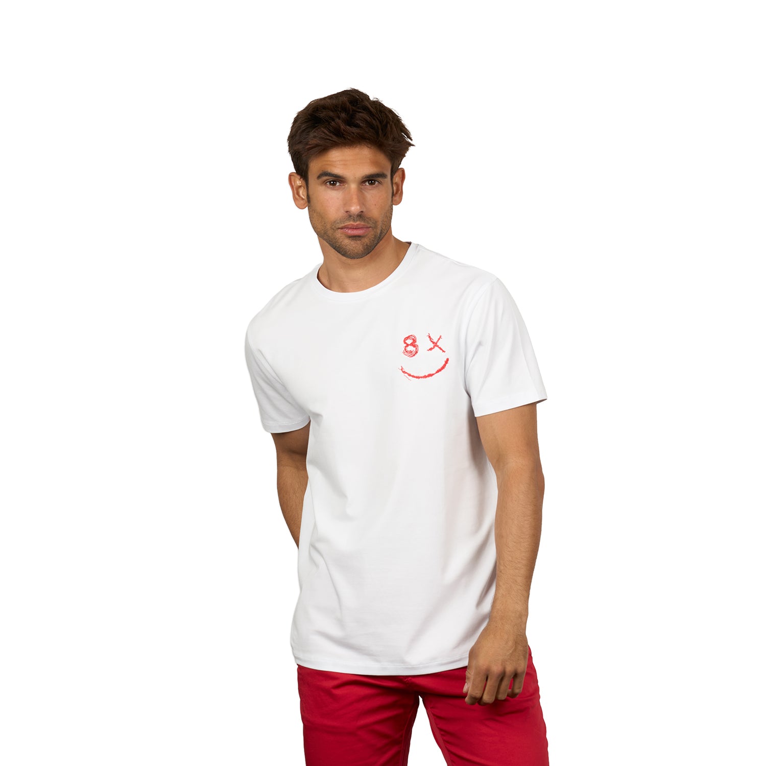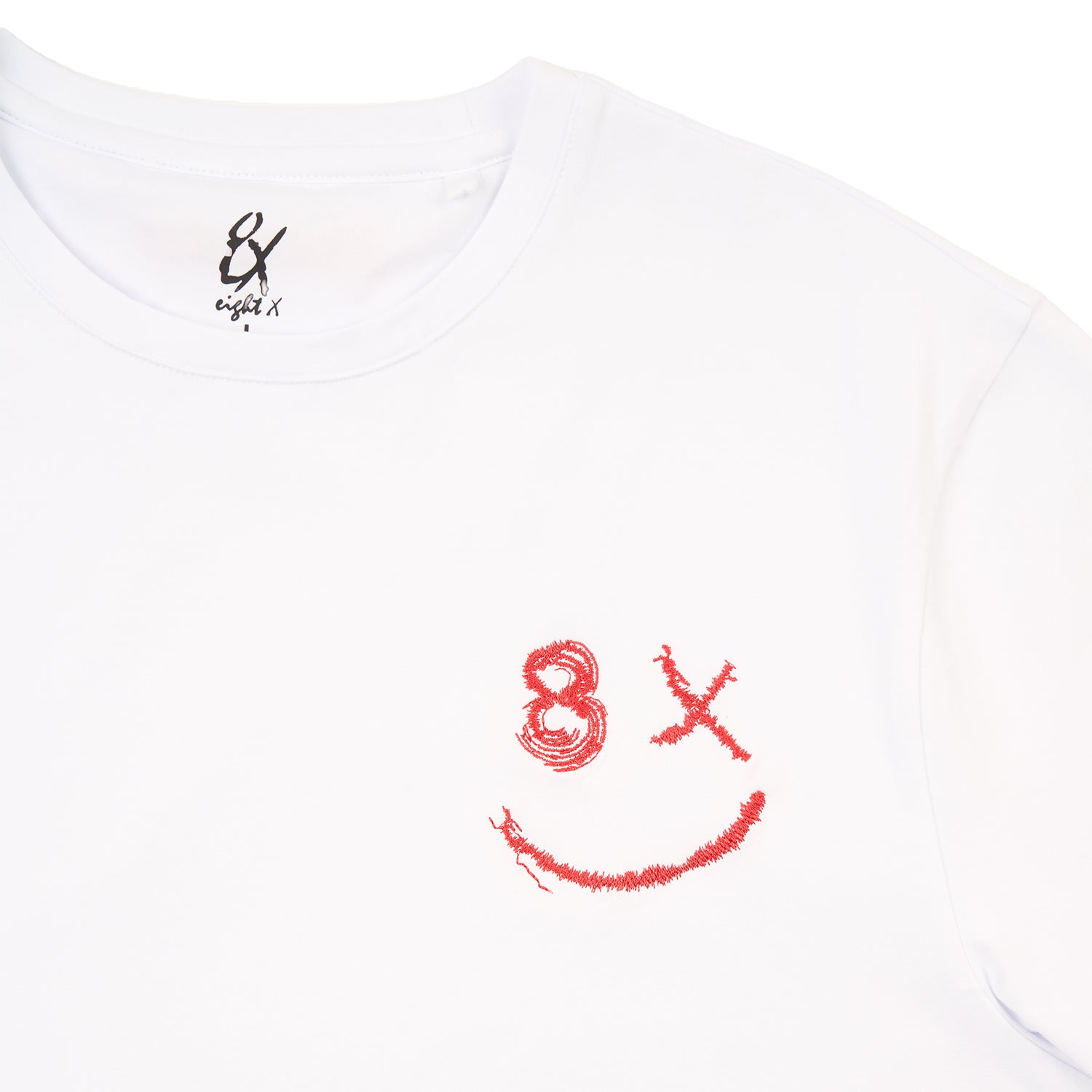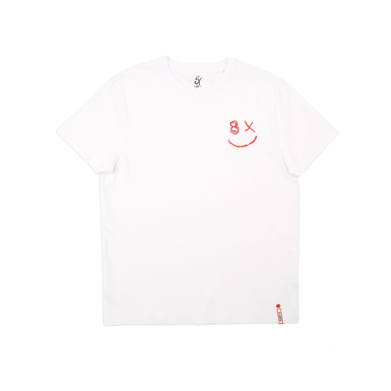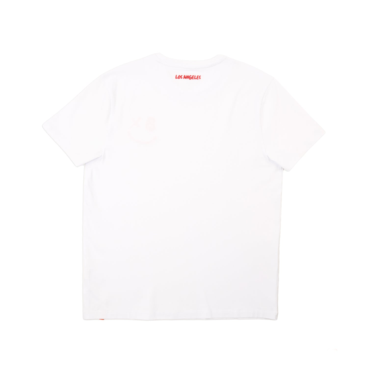 A men's graphic t-shirt featuring a slightly imperfect smiley design formed with Eight X detailing. Designed in Los Angeles, this tee includes raised embroidered Los Angeles text at the back neckline, blending raw character with a clean, minimal finish.