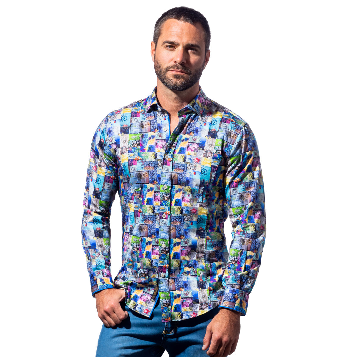 The Stories from the Sea button down shirt takes you on a journey down under. This multi-colored shirt features printed vignettes of our favorite sea friends, all in stunning color. Cut in our universally flatter Signature Slim Fit from ultra soft cotton, this Stories from the Sea shirt feels like floating right on the surface.
